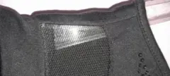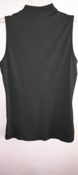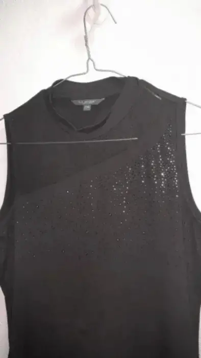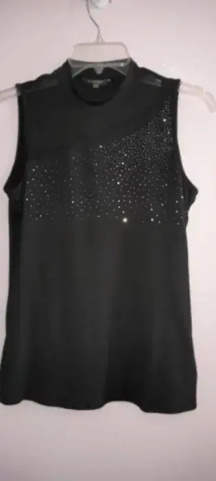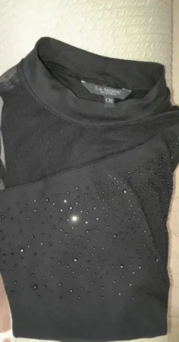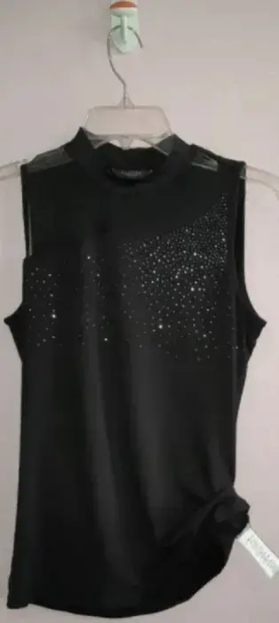 Blusa de tela suave y estirable, cuello alto, con pedrería brillosa negra y un poco de transparencia en pecho. Talla Chica. Nueva sin desperfectos.