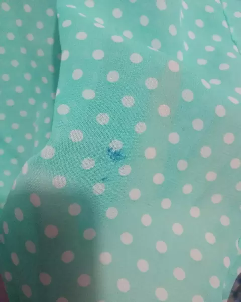 Blusa transparente verde. Blusa verde con bolitas blancas.Tiene una mancha azul en la aparte de atrásResorte en cuello, cintura y brazos