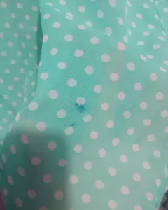 Blusa verde con bolitas blancas.Tiene una mancha azul en la aparte de atrásResorte en cuello, cintura y brazos