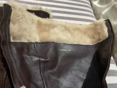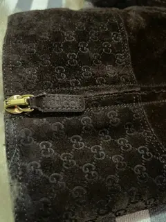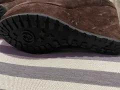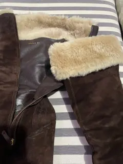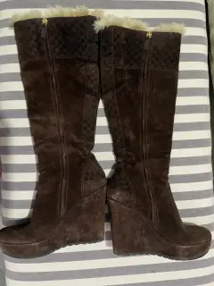 Hermosas botas de color café en ante y en la parte superior con peluche interno, puede usarse de dos formas , están en perfecto estado, el tacón es completo por lo tanto son muy cómodas