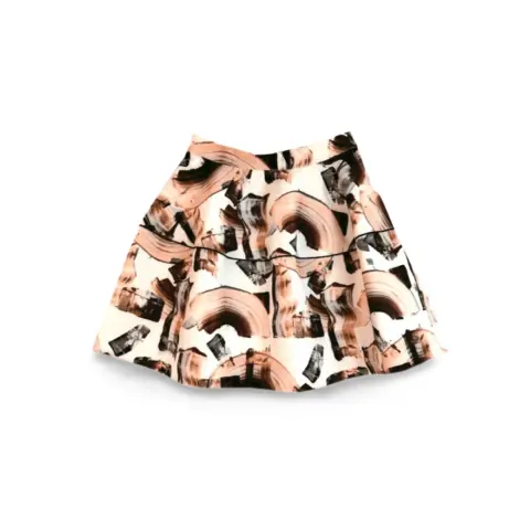 Falda de corte amplio con estampado abstracto. Modelo corto de talle alto y silueta con vuelo. Sin detalles, en excelente estado.
