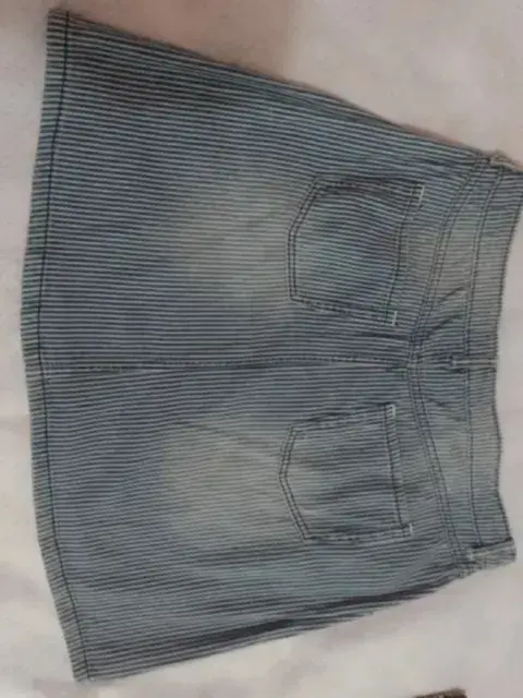Falda de mezclilla rayada. Falda de mezclilla rayada con blanco. Llega arriba de la rodilla. Tiene dos bolsas delanteras y dos traseras. Se puede usar con cinturon. Tiene cierre y botón. Es talla 14 y por dentro tiene botones y resorte para irle graduando el tamaño de la cintura. Queda perfecto para una talla 7.