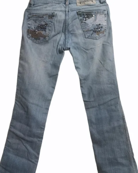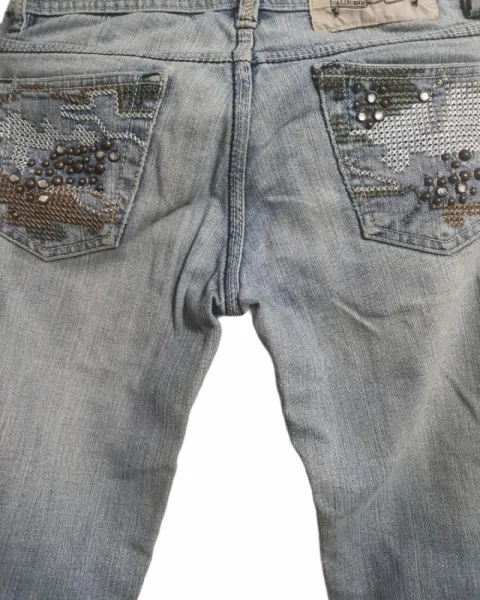 Jeans a la cadera con aplicaciones. Padrísimos jeans a la cadera en mezclilla clara y aplicaciones en las bolsas