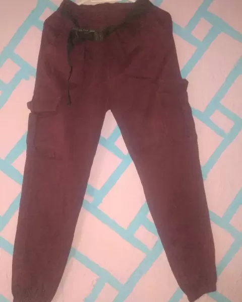 Ceros detalles. Color vino, cinturon ajustable. Resorte en cintura y tobillos. Con bolsas laterales