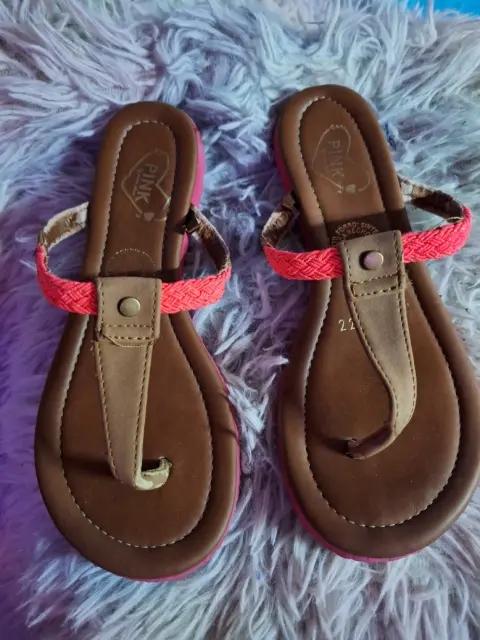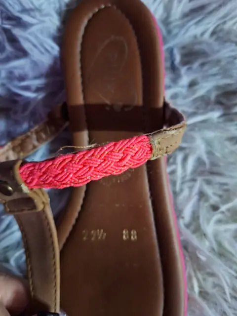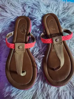Frescas sandalias de color café con rosa. Son de piso y lo rosa es como tejido. Como las tenía guardadas se está como descarapelando lo café de adentro de las cintas y de donde se mete el dedo (se alcanza apreciar en la foto) pero ni afecta su uso y no se ve puestos
