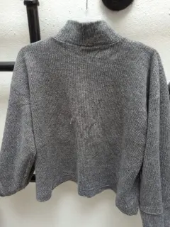 Sueter gris con forro térmico, talle corto, manga mas larga de lo normal, súper calientito, no incómodo.