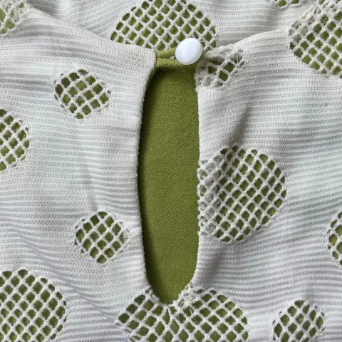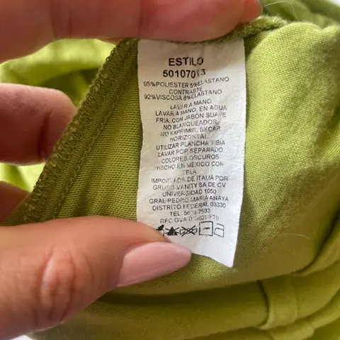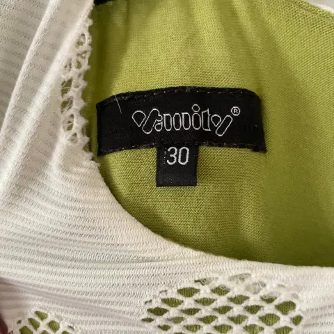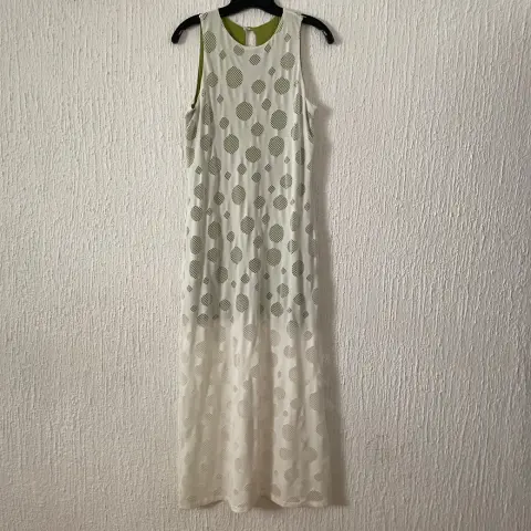 Descripción:Maxi vestido.Color blanco con fondo verde claro.Ceñido al cuerpo. Luce súper sexy pero a la vez es cómodísimo.Marca Vanity. Estado casi como nuevo.El fondo verde llega arriba de la rodilla y es tela como de playera.La tela exterior estira y el largo llega hasta los tobillos.Escote redondo.Talla 30 en etiqueta. Queda a mediana y aún estira.Telas poliéster, viscosa y elastáno.