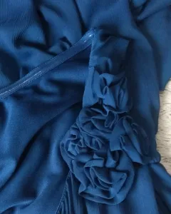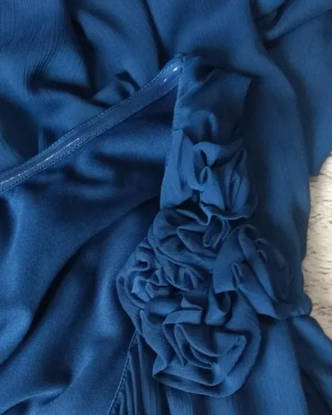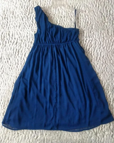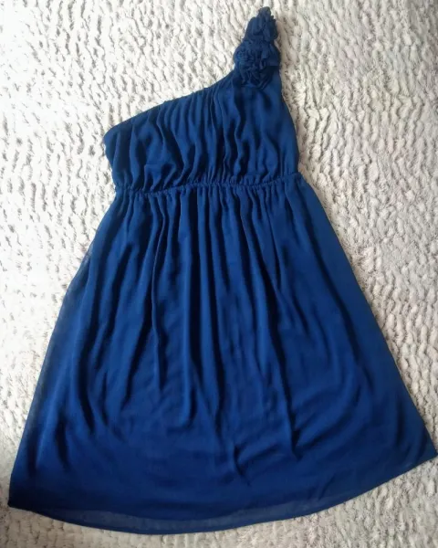 Lindo y tierno vestido corto azúl marino intenso, con un hombro descubierto, trae unas pequeñas flores de la misma tela en unos de los hombros, trae forro, con la elástico abajo del busto, es sueltito, con cierre al costado. Se ve súper hermoso con zapatillas plateadas. Es talla S, pero queda perfecto a M 💖