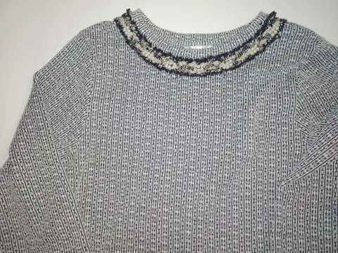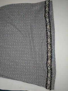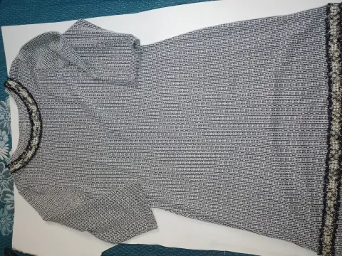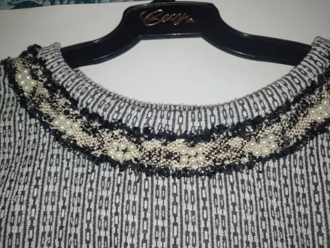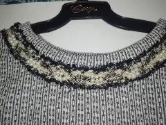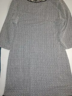 Vestido de Punto con collar de pedrería. $115Descripción:Hermoso vestido de punto, tipo bluson sin cierre, corte recto, ajustable. Mangas 3/4, color blanco con negro jaspeado. Cuello y bies de pedrería muy elegante.