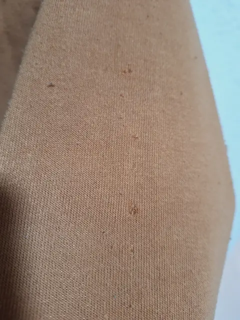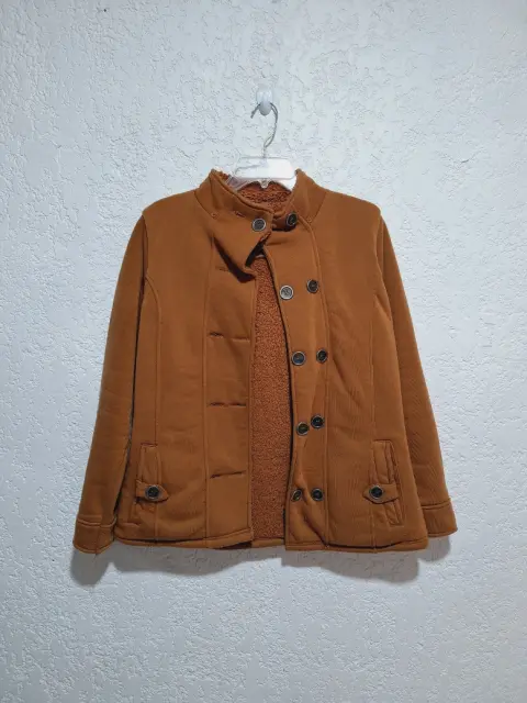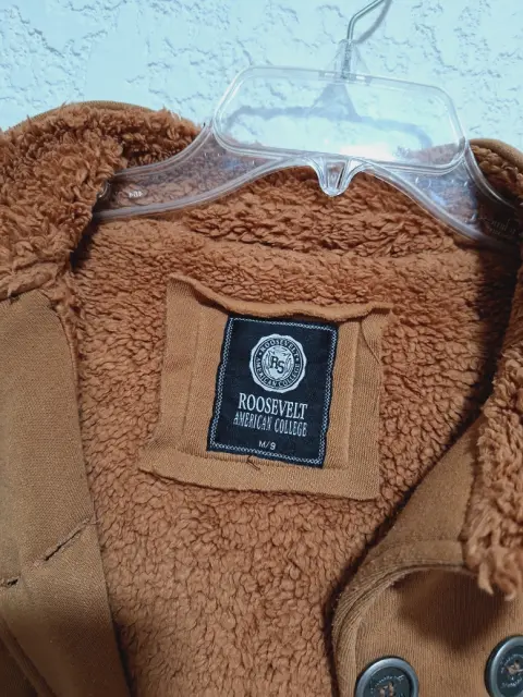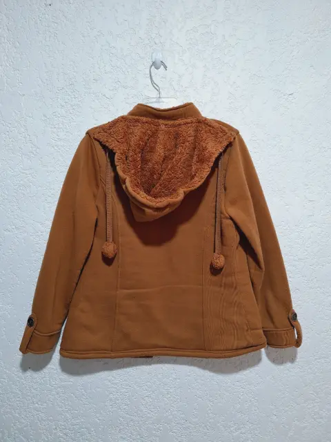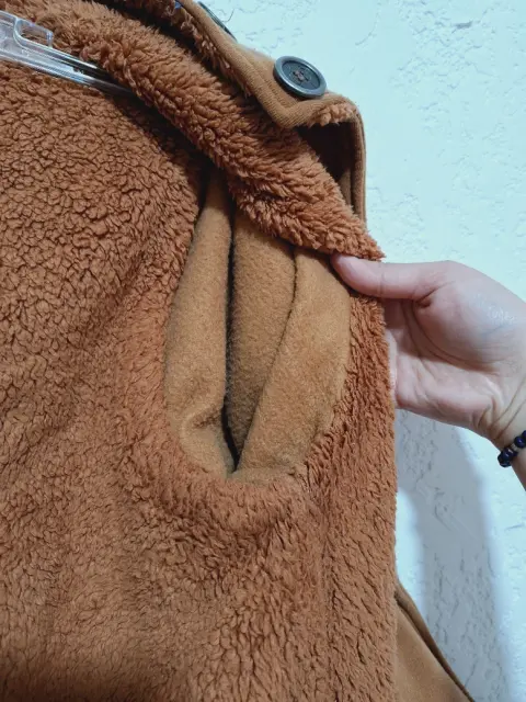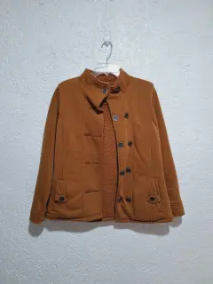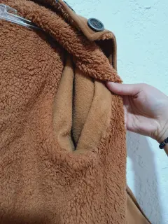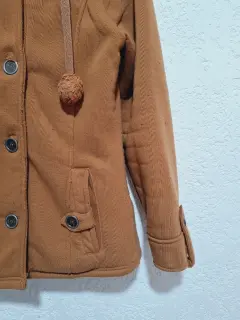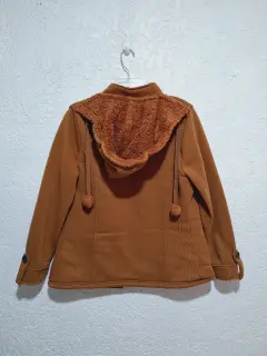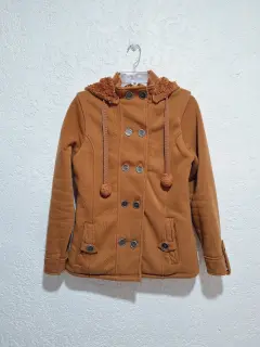 Abrigo color café con gorro que puede quitarse, está sujeto con botones; el abrigo tiene doble botón para abrocharse, tiene dos bolsas delanteras a cada lado, es de peluche por dentro (excepto las mangas, pero la tela es calientita), en una manga tiene unos ligeros raspones como mini agujero Ver foto.Talla M