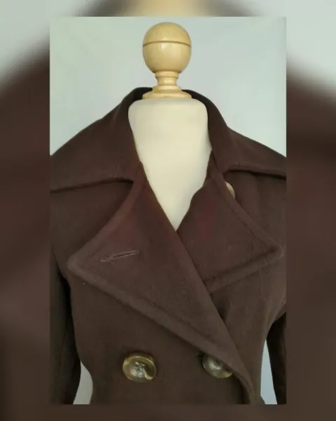Abrigo en lana peinada color TABACO, cuello clásico c/solapas muesca, cierre p/botonadura doble frontal, 2 bolsillos vivo frontales y forro interior de fantasía. Talla 32. Dimensiones cms: 38 hombro, 54 axila, 45 cintura, 58 zona baja, 65 largo, 62 largo manga. 80% lana, 20% poliamida. Para lavado en seco.***APROVECHA, ESTA MARCA YA NO COMERCIALIZA ABRIGOS CON ESTE PORCENTAJE DE LANA***ESTA PRENDA ESTA AVALADA CON EL SIMBOLO *WOOLMARK BLEND* QUE CONSTATA EL ALTO ESTANDAR DE CALIDAD DE ESTA PRENDA ELABORADA EN LANA***