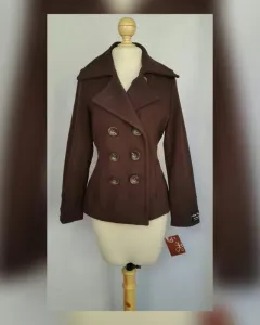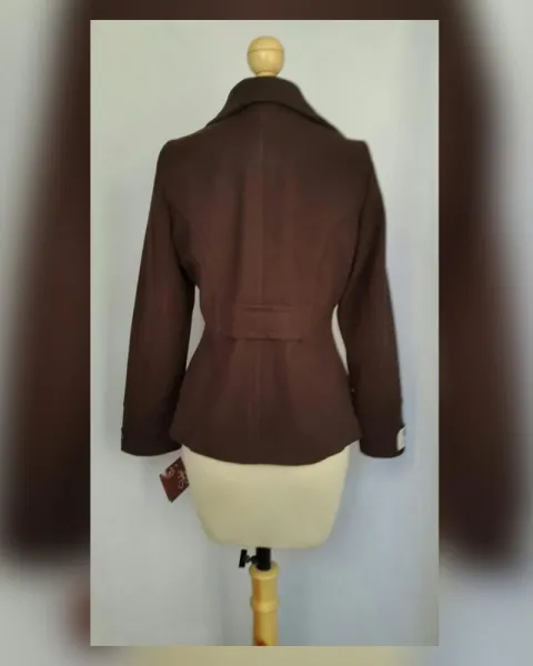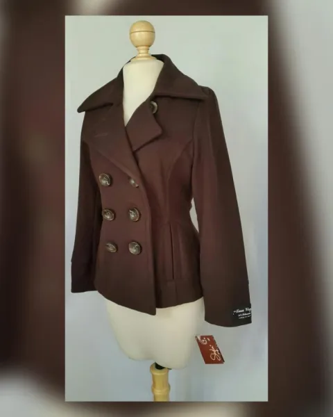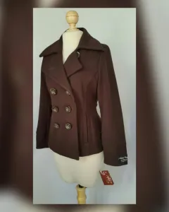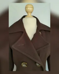 Abrigo Corto en Lana Peinada tono Tabaco. Abrigo en lana peinada color TABACO, cuello clásico c/solapas muesca, cierre p/botonadura doble frontal, 2 bolsillos vivo frontales y forro interior de fantasía. Talla 32. Dimensiones cms: 38 hombro, 54 axila, 45 cintura, 58 zona baja, 65 largo, 62 largo manga. 80% lana, 20% poliamida. Para lavado en seco.***APROVECHA, ESTA MARCA YA NO COMERCIALIZA ABRIGOS CON ESTE PORCENTAJE DE LANA***ESTA PRENDA ESTA AVALADA CON EL SIMBOLO *WOOLMARK BLEND* QUE CONSTATA EL ALTO ESTANDAR DE CALIDAD DE ESTA PRENDA ELABORADA EN LANA***