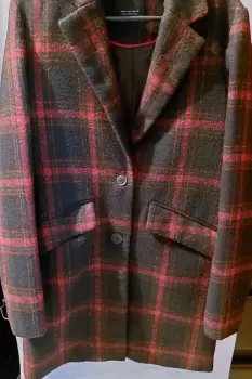 Abrigo estampado escocés a cuadros vino con negro, corte recto lana con nylon