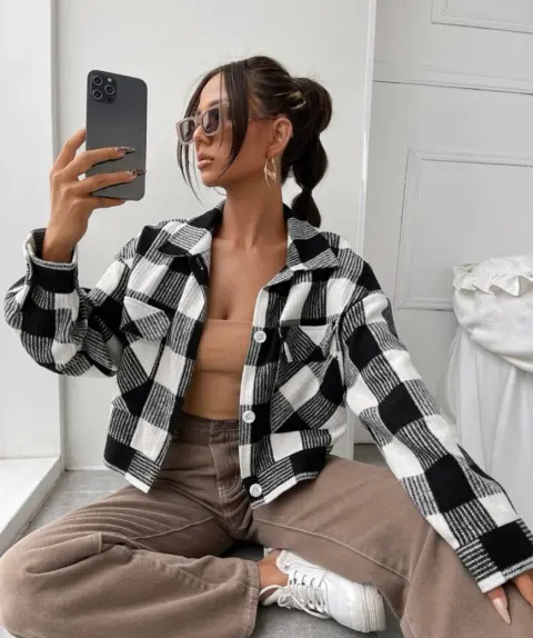 Abrigo de cuadros blanco y negro muy bonito, tiene una puesta, sin detalle. Viene amplio es talla XL (36/38 MX)