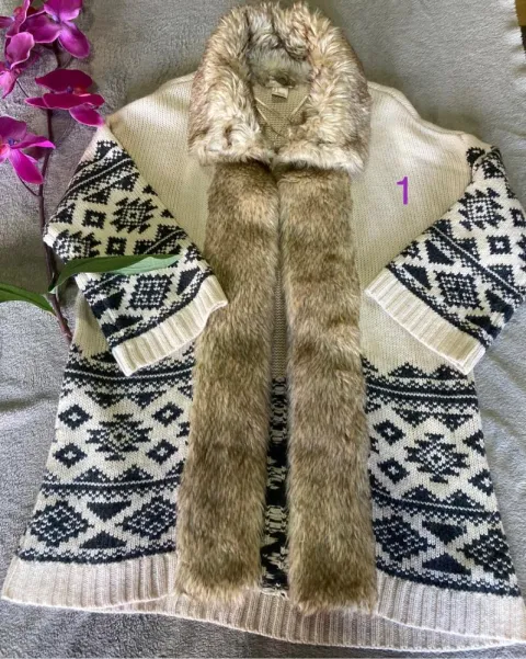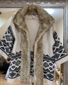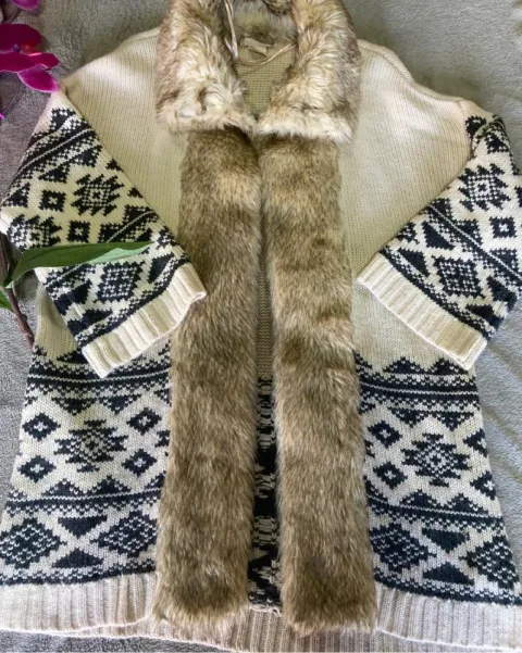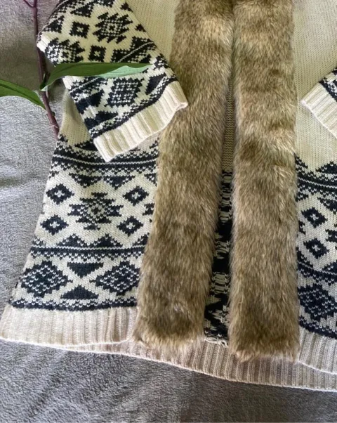 Prepárate para el fin de año con este abrigo tejido con cuello de peluchito, estilo Etnico