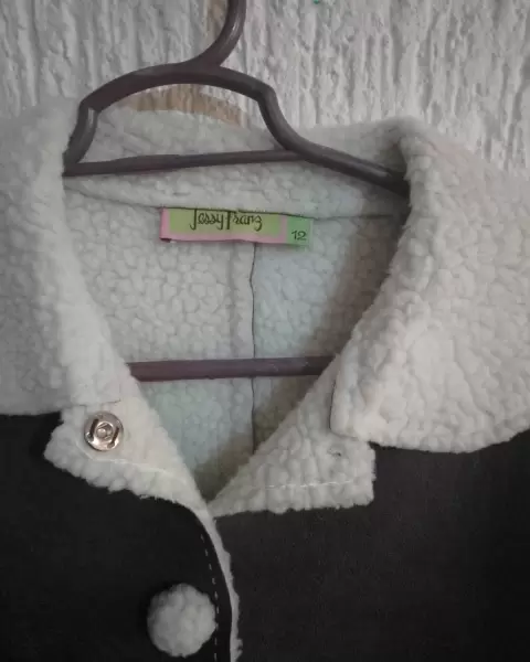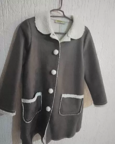 Es un abrigo de vinipiel, con forro interno de peluche y detalles de peluche en cuello, orilla de bolsas y botones. Mide 81 cms de largo.