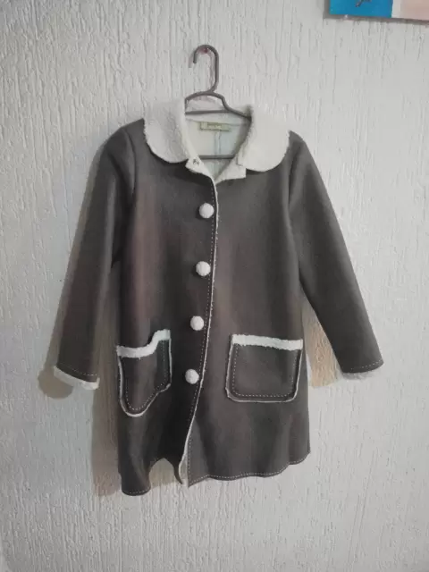 Abrigo de niña - kids. Es un abrigo de vinipiel, con forro interno de peluche y detalles de peluche en cuello, orilla de bolsas y botones. Mide 81 cms de largo.