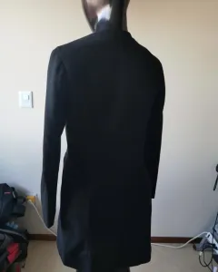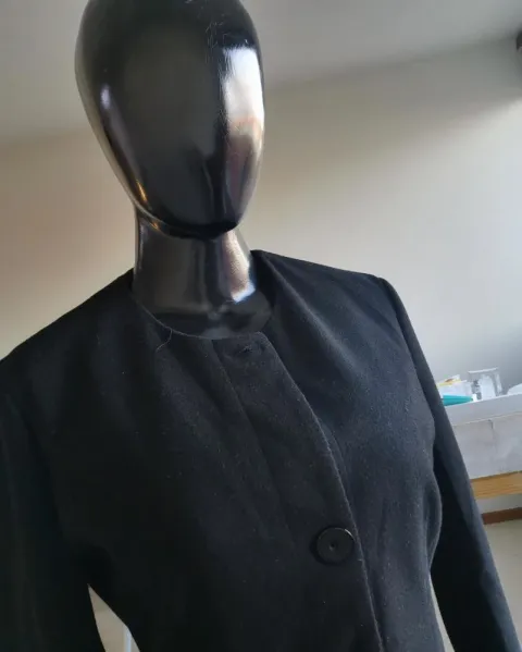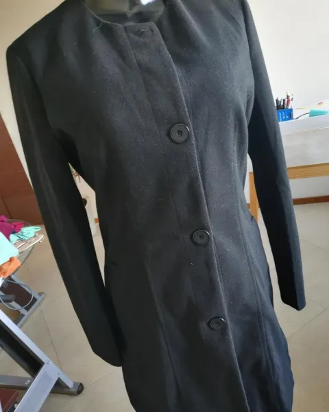 abrigo de vestir en color negro tiene botones negros grande y es de cuello redondo