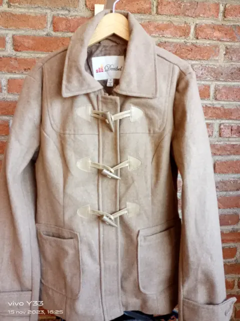 Abrigo Decibel. Lindo abrigo color arena talla mediano, con cierre y botones, está súper bello trae bolsas