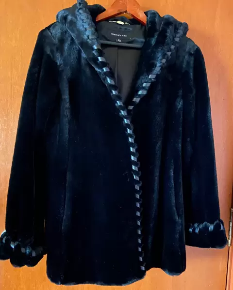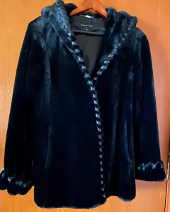 Abrigo gala c/capucha Jones New York. Chamarra de gala para eventos, pelo sintético, con capucha y aplicaciones de piel