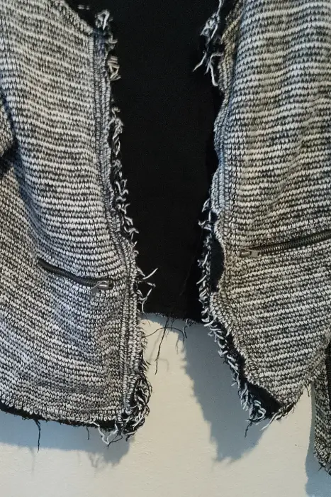solo una puesta abrigo gris con negro trae cierres🐰🖤 es deshilachado de fabrica talla M Zara