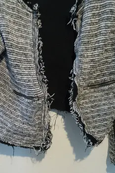 abrigo gris con negro deshilachado. solo una puesta abrigo gris con negro trae cierres🐰🖤 es deshilachado de fabrica talla M Zara