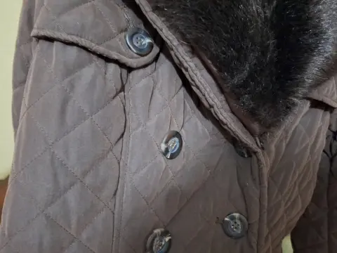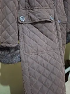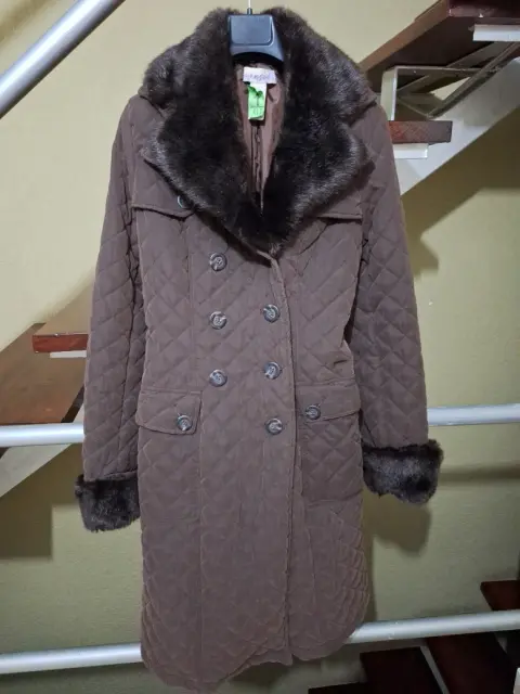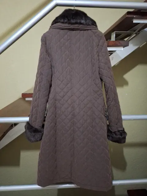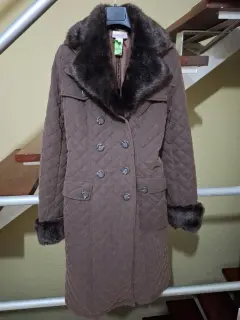 Abrigo largo color café, con solapa y puños desmontables, protege muy bien del frío, cómodo,elegante, marca linda la silueta por el tipo de costura, en excelente estado solo se le coció algunos centímetros del forro le falta un botón.