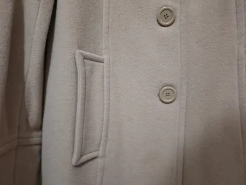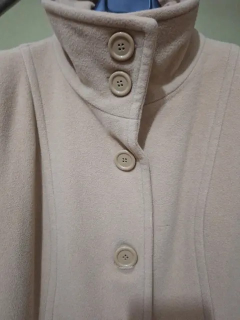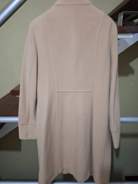 Abrigo largo color camel, cuello alto, con bolsas, tres botones y forro, con las pinzas en el frente y trasero afina la silueta. En perfectas condiciones, su uso fue muy poco. Talla L puede quedarle a una talla 8 a la 10.