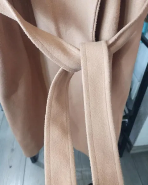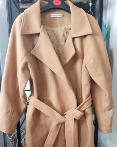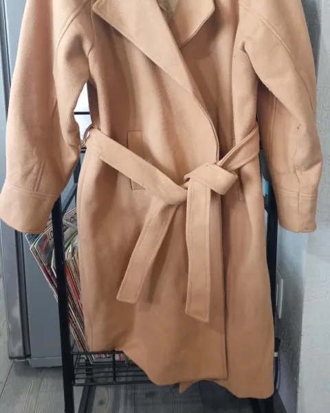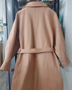 Abrigo a la rodilla con botones de presión ocultos y bolsillos de ojal en diagonal al frente. Cinturón extraible en la cintura. Bastante cálido. Sin manchas o detalles