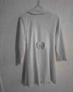 Es un abrigo largo, en color gris claro, de algodón, en línea A, da muy bonita forma, es talla 12, tiene tres botones, ideal para la temporada invernal, mide 92 cms de largo