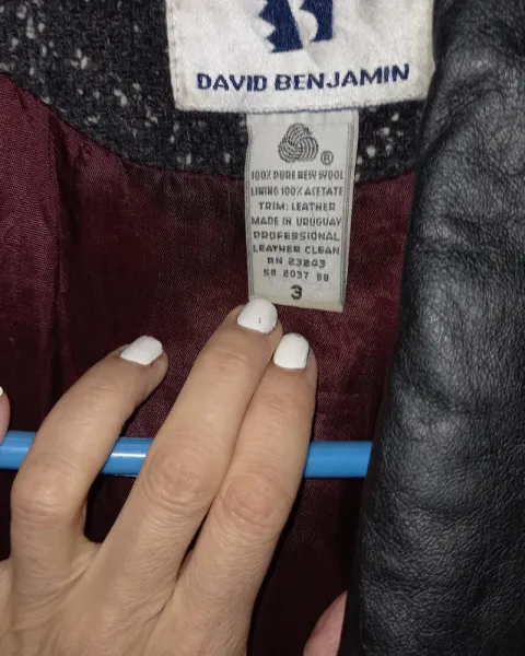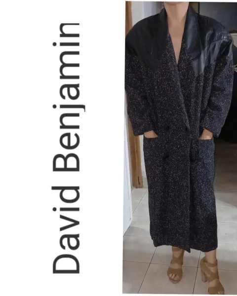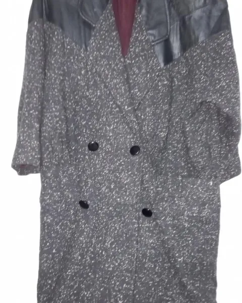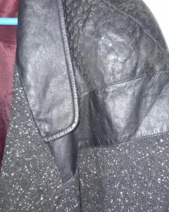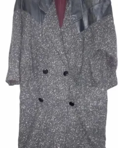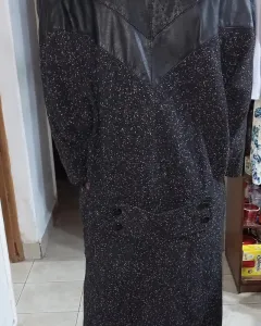 Abrigo largo jaspeado, negro con blanco, cuello y hombros de piel, hecho en Uruguay, 2 bolsillos al frente, forro satinado color vino, muy calientito y elegante