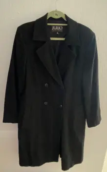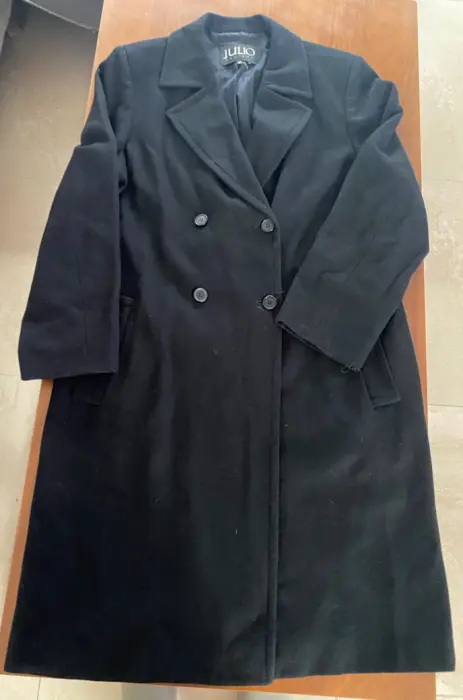 Aprovecha antes del frío y llévate abrigo marca Julio, 100% lana, color negro,largo 1.05cm, talla 11. Ni es pesado y está en excelente estado!