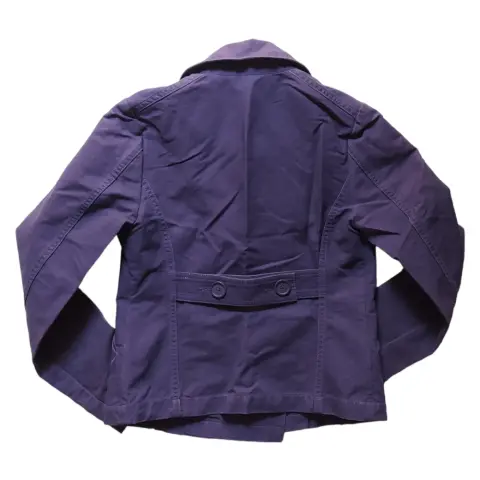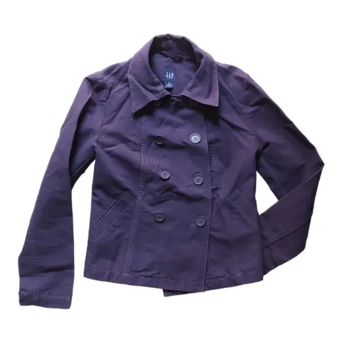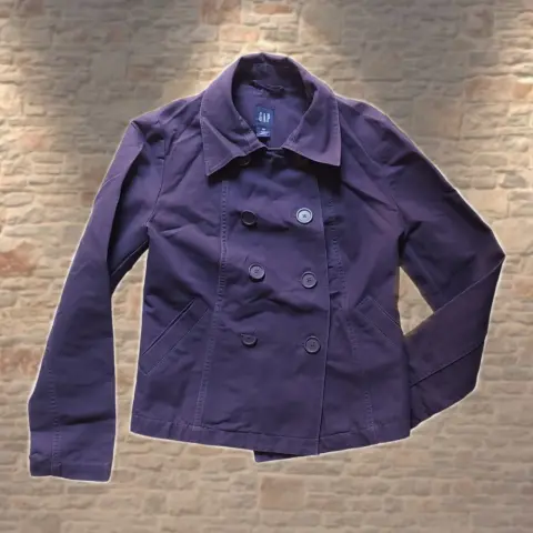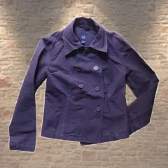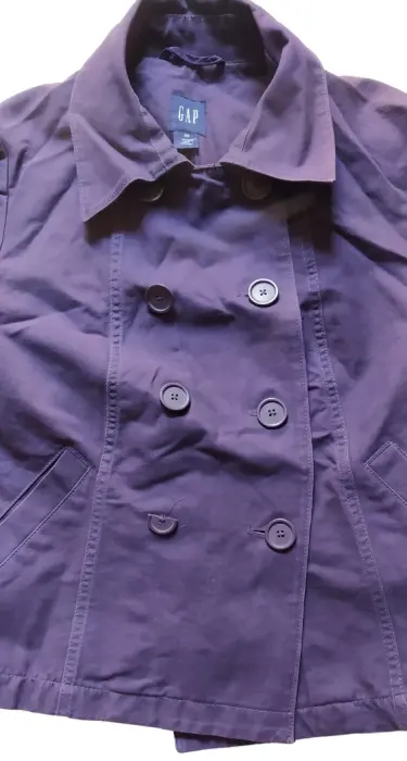Abrigo morado marca GAP. Abrigo morado, marca GAP, talla XS, 100% algodón, bolsas a los costados, tiene roto un botón como se muestra en las fotos pero se puede cerrar bien.Hombro a hombro 36 cm.Axila a axila 43 cm.Largo total 53 cm.