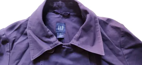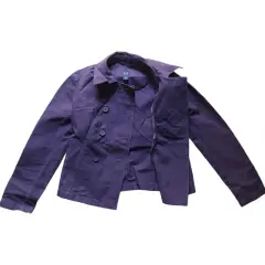 Abrigo morado, marca GAP, talla XS, 100% algodón, bolsas a los costados, tiene roto un botón como se muestra en las fotos pero se puede cerrar bien.Hombro a hombro 36 cm.Axila a axila 43 cm.Largo total 53 cm.