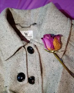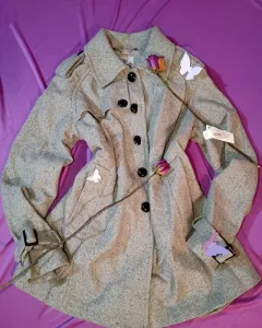 Color gris claroBotones grandes color negroTela gruesaMedidas:Espalda 44 cmCintura 60 cmLargo78cmBusto 52cmLargo de la manga 62Talla L