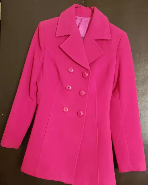 Abrigo largo color rosa mexicano, de lana, calientito, con bolsas a los costados.