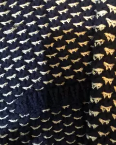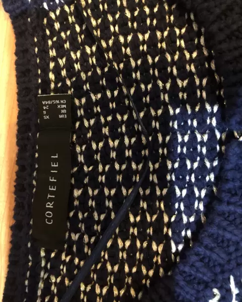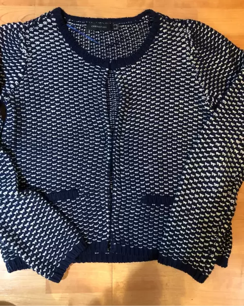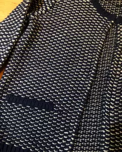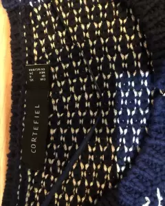 Abrigo tejido en azul marino blanco y dorado. Abrigo corto tejido de vestir, de axila 46 cm de largo 50 cm y de hombro 34