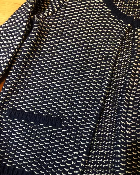 Abrigo tejido en azul marino blanco y dorado