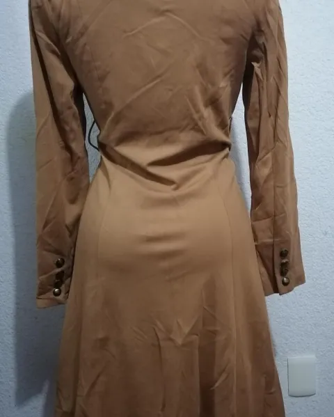 Hermoso Abrigo café, con forro, botones en manga que dan toque elegante, los botones delanteros son de la misma tela, tiene para que añadas un cinturón a tu gusto, puede ser también vestido xq tiene forro, tiene una cinta que cruza a la perfección la prenda. Medidas largo 103cm, largo Manga 63cm, axila a axila 50cm