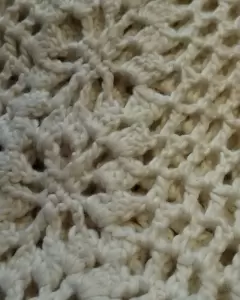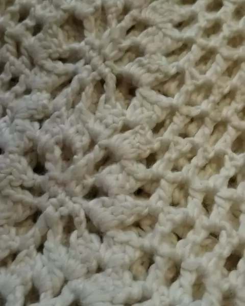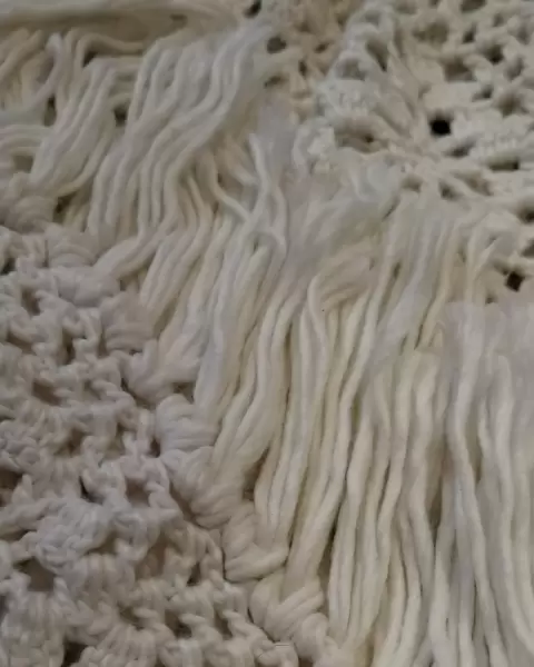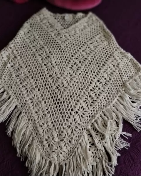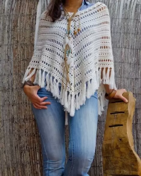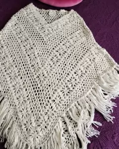 Capa tejida color hueso. Capa tejida color hueso corte en V con flecos, tejido abierto, con flecos, textura ligera