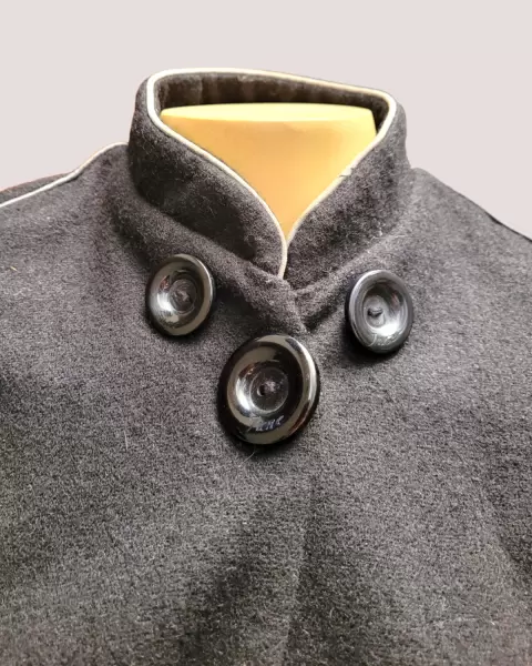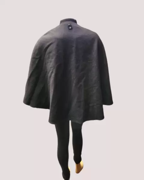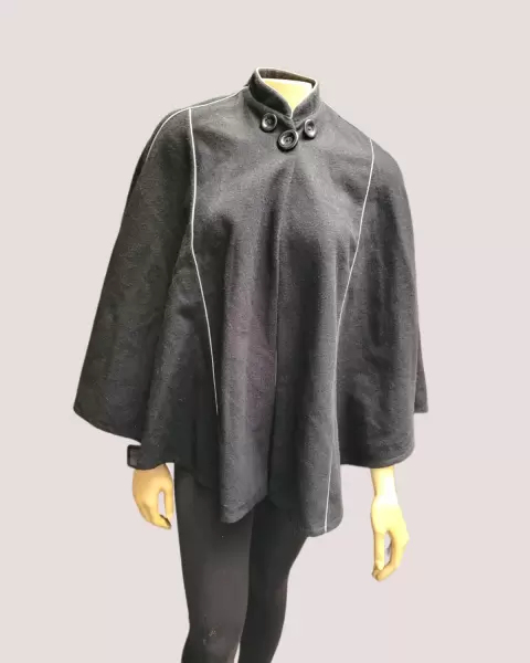 Genisa victoriana La capa corta del hombro, unilateral, color negro, extra espaciosa, permite una cómoda gama de movimiento, 3 botones y cierre de pestañas debajo del cuello, botón de acento detrás, mide el centro del frente desde el cuello hasta el dobladillo alto de 28 ", circunferencia alrededor del dobladillo de 42", el collar mide 1 1/2 "alto, la abertura del cuello 13.5", hecha de nylon, en buenas condiciones.