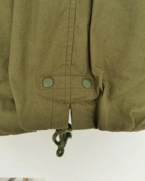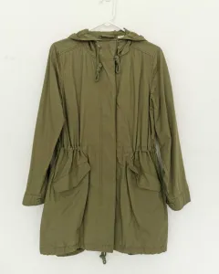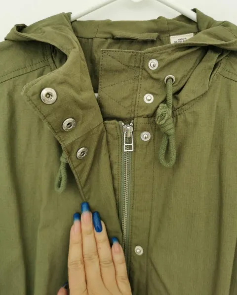 Casadora de tela tipo loneta color olivo. Cuello alto con capucha. Los puños de las mangas tienen 2 botones para ajustar. Siper cubierto con solapa con botones. Jareta con cintas para ajustar en la capucha, cintura y abajo. Bolsillos de jareta con solapa al frente. Talla S.
