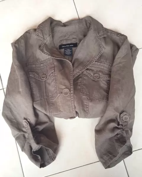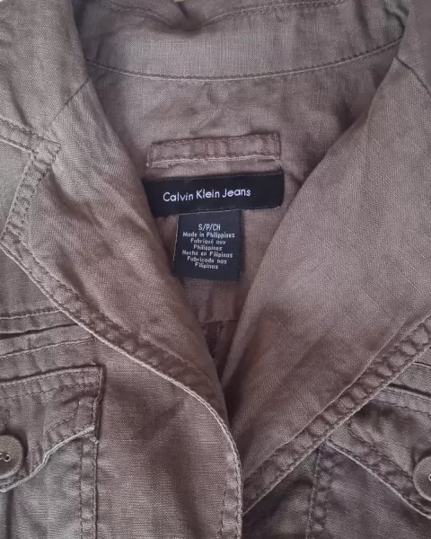 Cazadora de lino CALVIN KLEIN. Cazadora color verde militar, con jareta en cintura y mangas, cuatro bolsos y botones al frente, 100% lino, en excelente estado