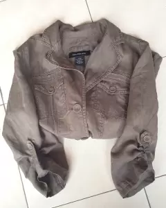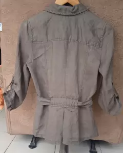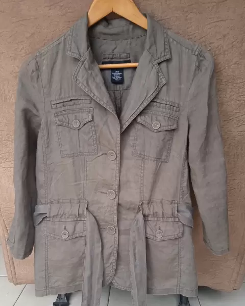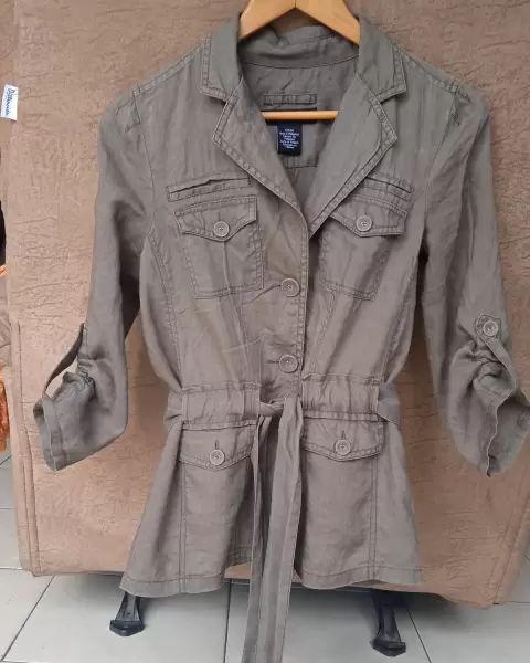 Cazadora color verde militar, con jareta en cintura y mangas, cuatro bolsos y botones al frente, 100% lino, en excelente estado