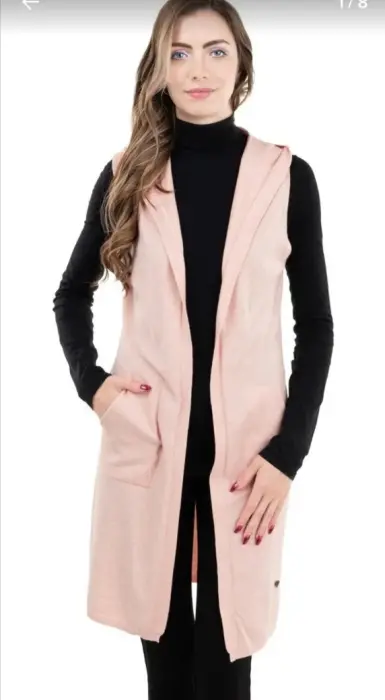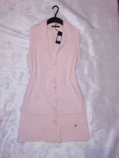 Chaleco largo con bolsas. Chaleco largo con bolsas, color rosa de tejido de punto fino suave, unitalla
