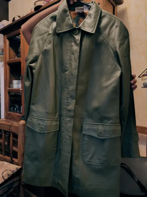 Chamarra larga de piel color verde 💚. Chamarra de piel larga, de uso sin ningún detalle, en buenas condiciones, talla M