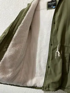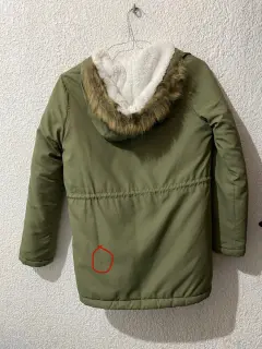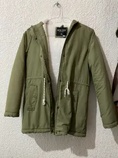 Linda y muy calientita chamarra tipo cazadora con forro tipo borrega, color verde soldado. Viene con gorro, cierre y broches que funcionan perfectamente.Tiene un detalle en la parte posterior que viene marcada en las últimas dos fotos