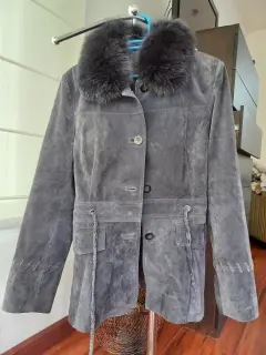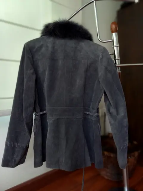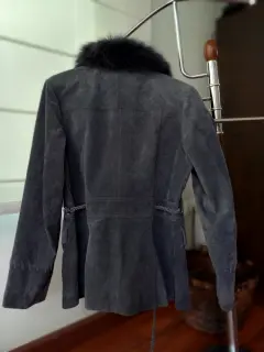 Chaqueta gris de gamuza, con cuello de piel. Super elegante, entallada a la cintura.Ideal para un look de noche o transformar el look de día en un look elegante.