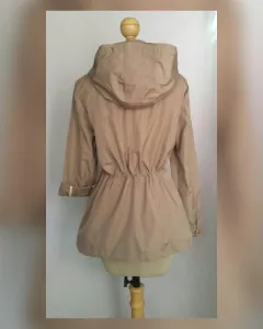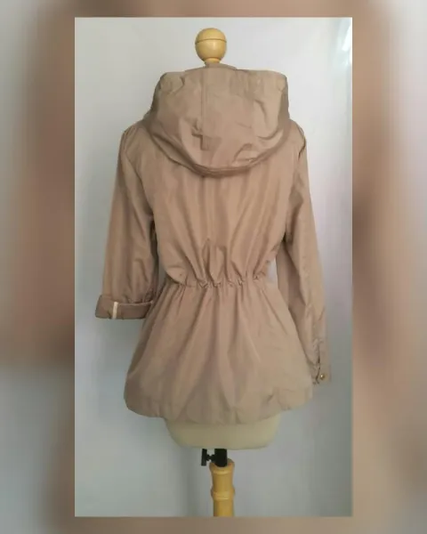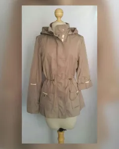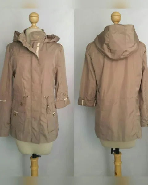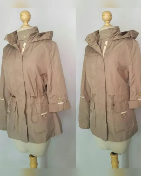 Chubasquero weatherproof color HAZEL WOOD, manga larga acabada en puño c/tira c/snap convertible a 3/4, cierre p/cremallera cubierta p/tapeta c/snaps, jareta en cintura p/mejor ajuste, cuello Perkins, capucha NO DESMENTABLE y oculta en cuello, 2 bolsillos plastrón frontales c/tapeta c/snap y tira y forro interior. Talla L. Dimensiones cms: 43 hombro, 55 axila, 51 cintura, 59 zona baja, 71 largo 62 largo manga. 100% poliéster. Para lavado en casa.***EL TONO EXACTO ESTÁ EN LA FOTO NÚM 5***ES LIGERAMENTE IMPERMEABLE***