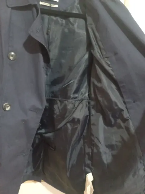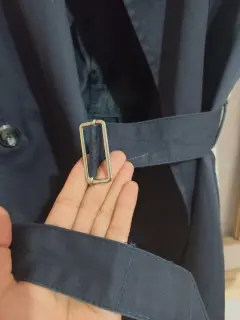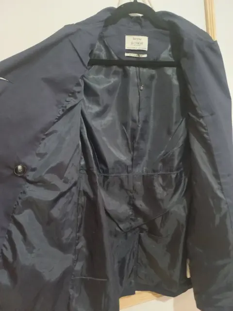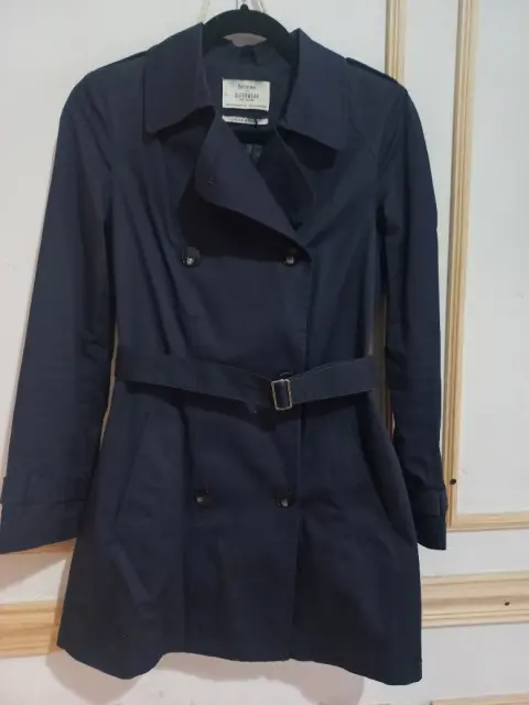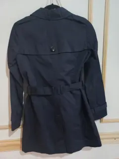 Gabardina azul. Gabardina talla xs, aunque puede quedar a S porqur viene amplia, se encuentra en perfecto estado tanto exterior como del.forro, las cintas tac yo se las cosí para mayor ajuste porque me gustaba usarla pegadita.